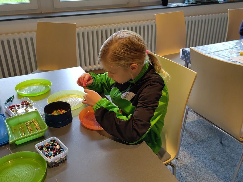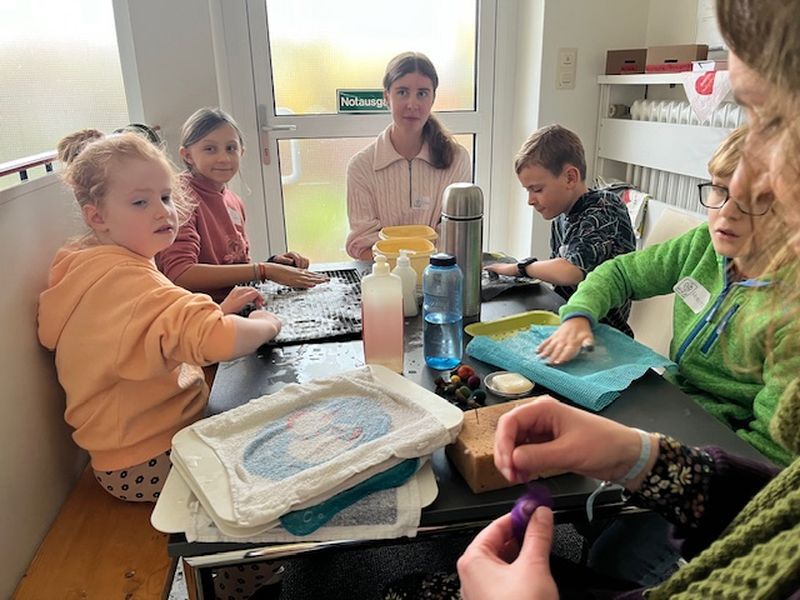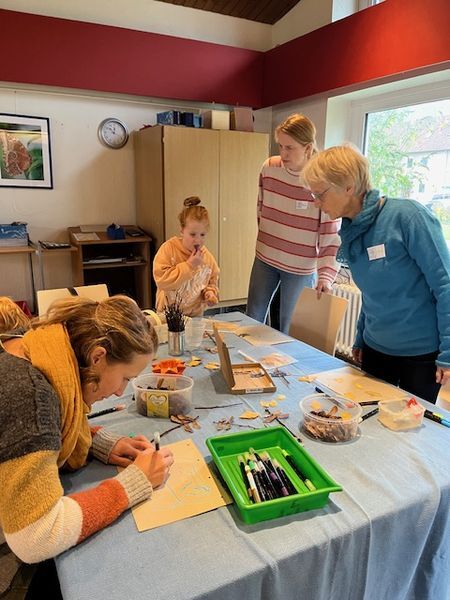Zur Begrüßung fand sich ein großer Kreis aus Kindern, mitmachenden Eltern und dem Vorbereitungsteam der "Herbstfeen" im großen Gemeindesaal zusammen. Frau Pastorin Glaubitz und die Organistorin Katrin Ludwig erinnerten an die wunderbare Gabe Gottes, mit Phantasie und Farbe die Welt zu entdecken und kreativ zu gestalten und luden ein, das an den zehn vorbereiteten Stationen auszuprobieren. Und tatsächlich, auch einige nach eigener Aussage völlig unbegabte Väter freuten sich darüber, etwas mit den Händen zu werken zu können - die Kinder sowieso.