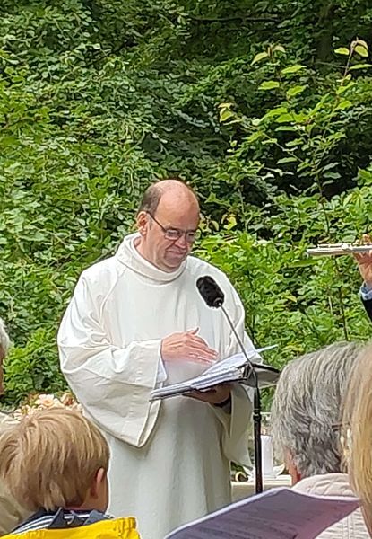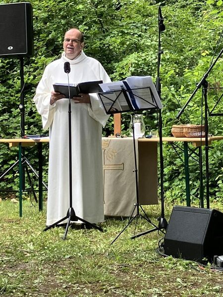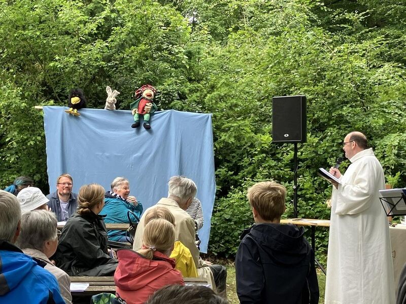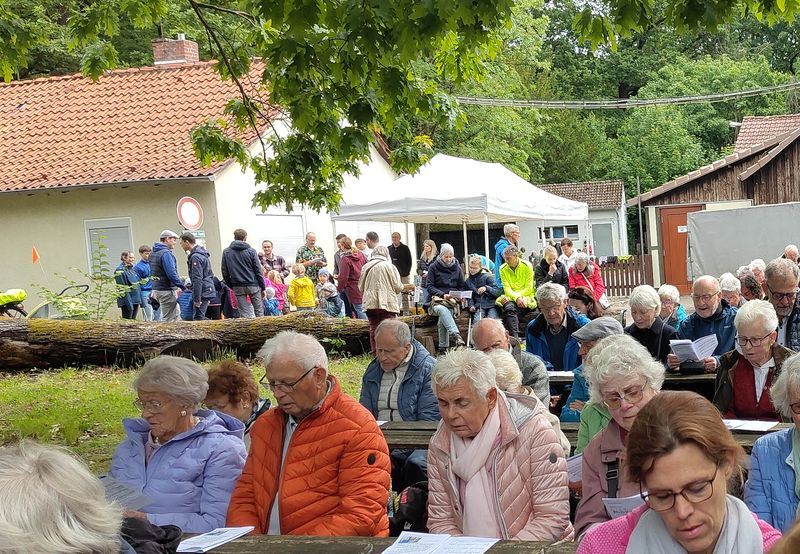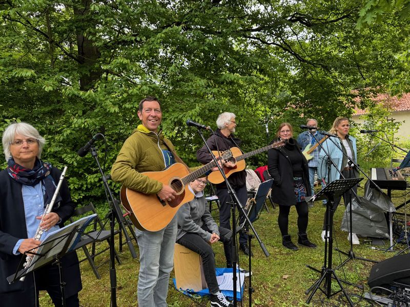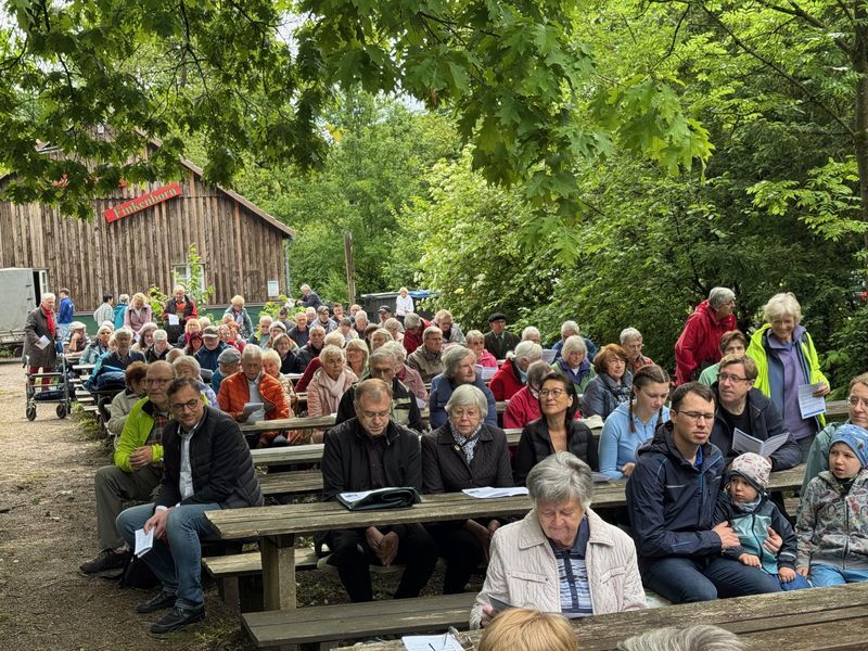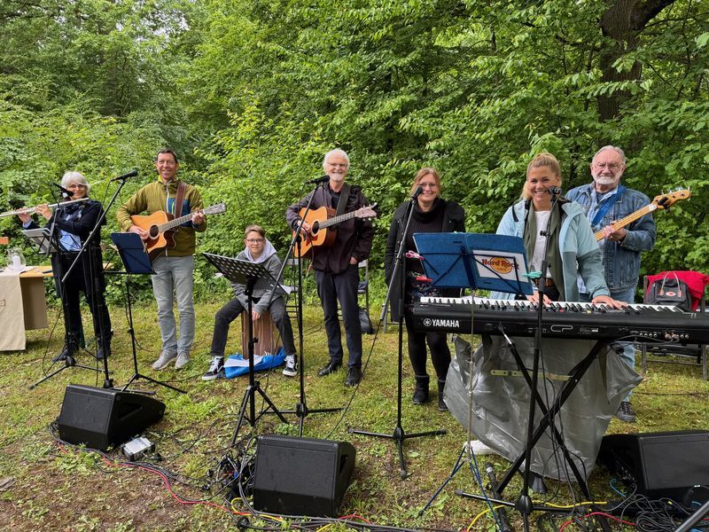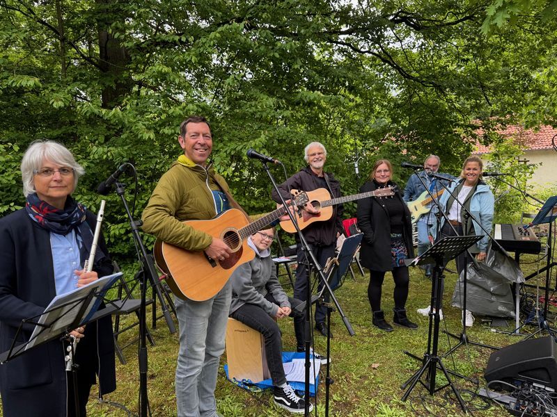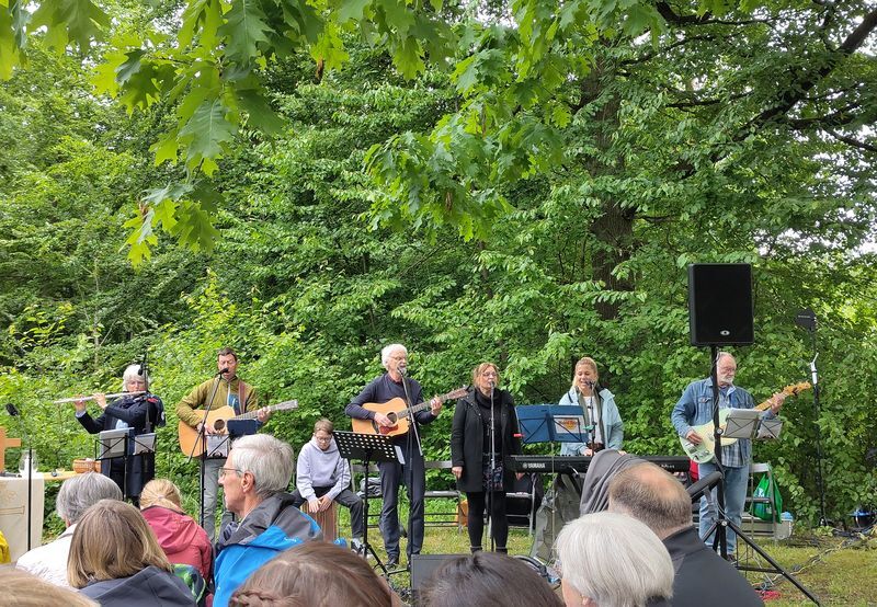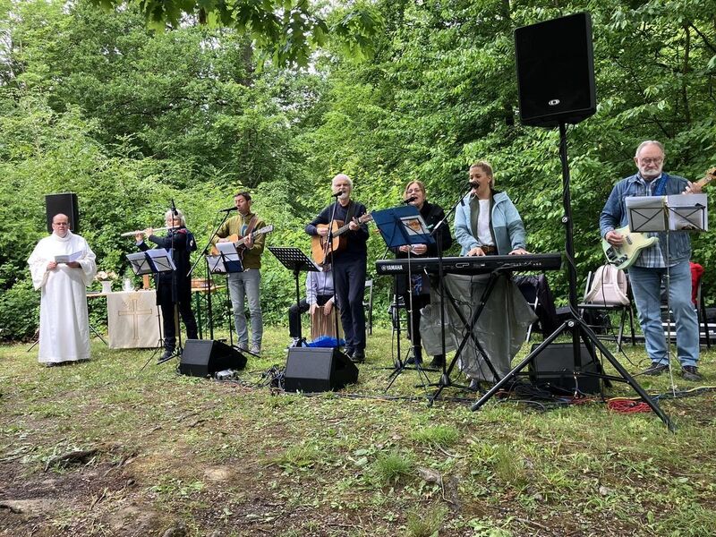 Die Kreuz-Kirchenband in großer Besetzung mit professioneller Technik von Yannik Scheler begleitete das Singen der neuen Kirchenlieder, die zum Teil vertraut aber auch ganz neu vom Kirchentag in Hannover mitgebracht waren und begeisterten. „Mutig, stark, beherzt“ schallte es durch den Wald, wo zwischendurch bei den Gebeten die Buchfinken und Amseln uns flöteten.