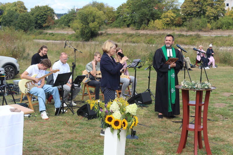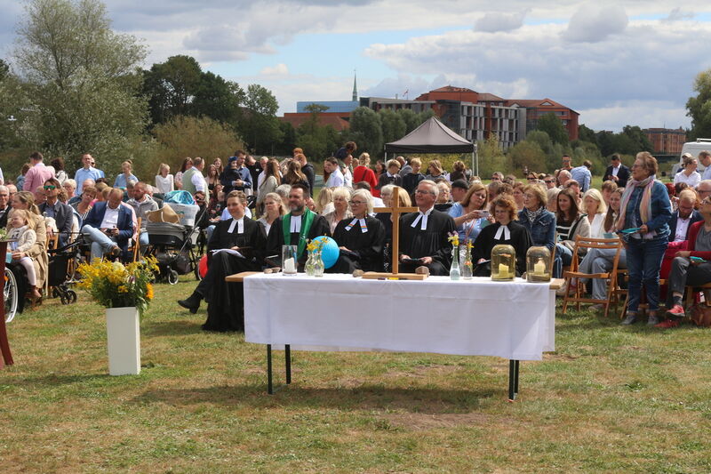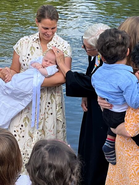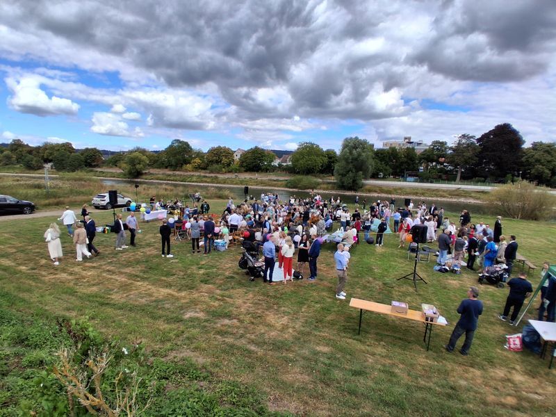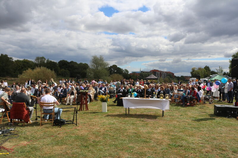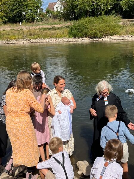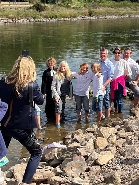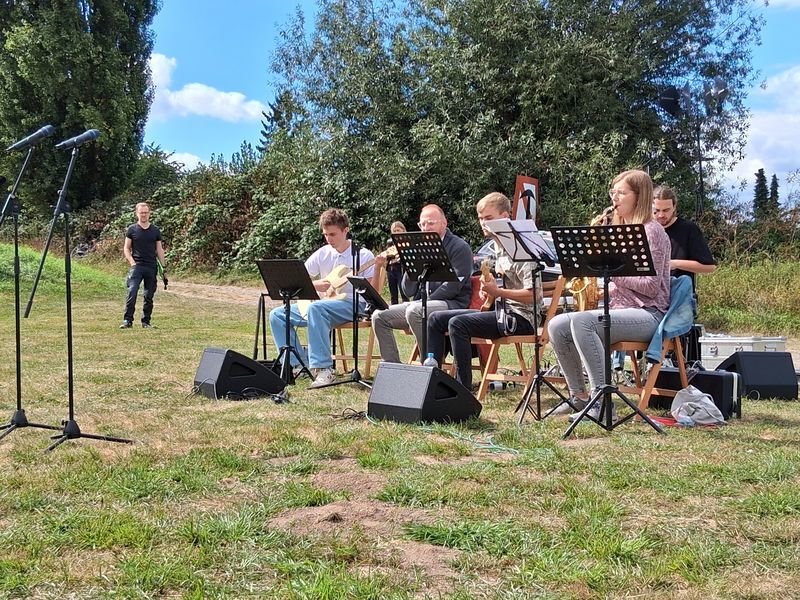 Die beteiligten Pastor:innen tauften Kinder und Jugendliche mit Weserwasser, Familien, Freunde und Gemeinde begleiteten die Täuflinge bei diesem Ereignis. Popkantor Marco Knichala sorgte mit seiner Band für die Musik und viele fleißige Hände für das Kaffeetrinken und Bastelangebote im Anschluss.
