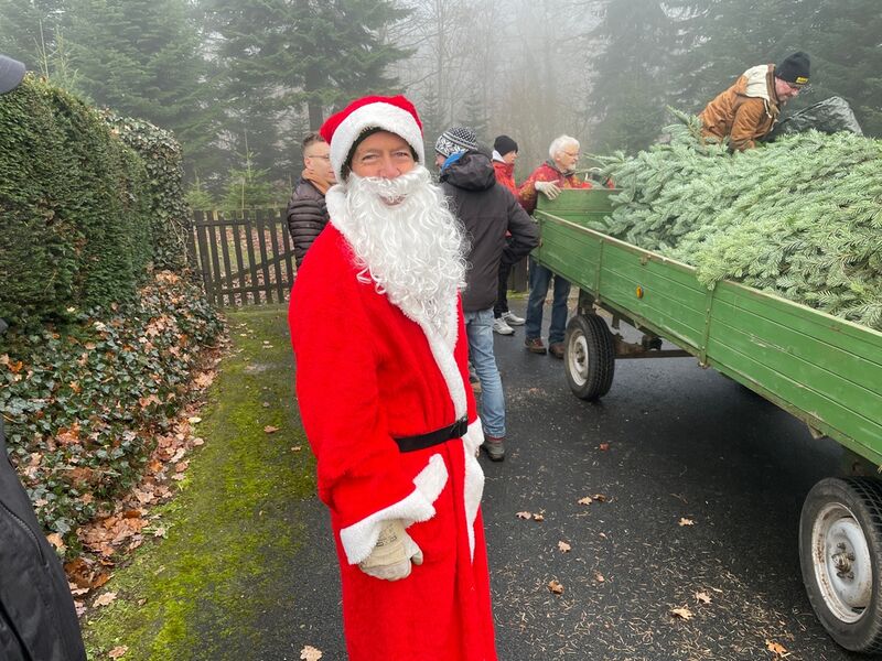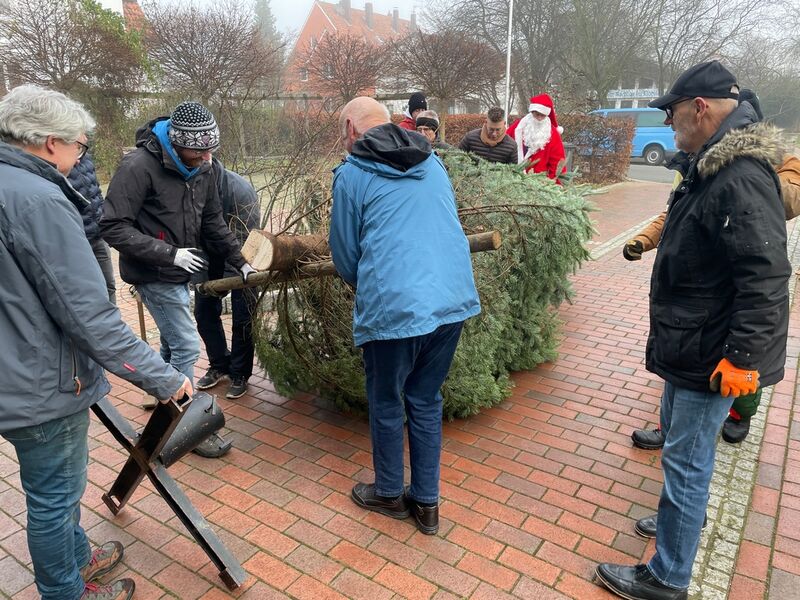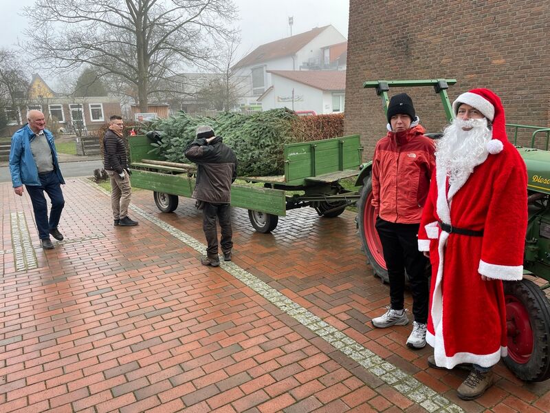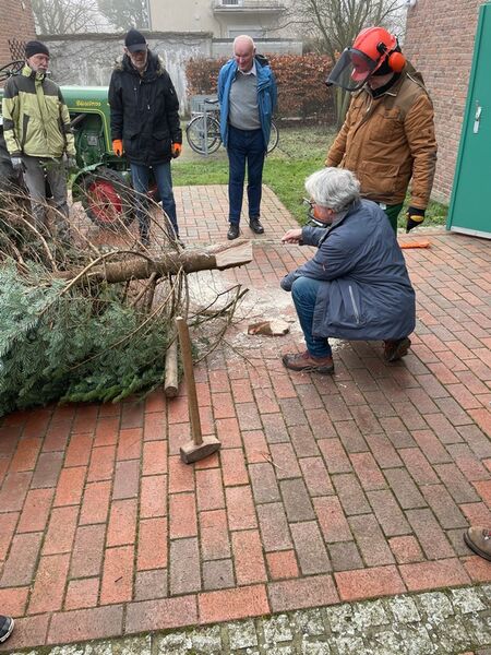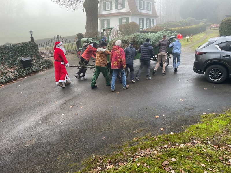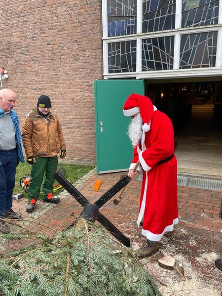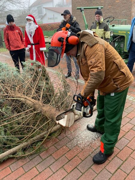 Martin Sprang als Weihnachtsmann fuhr mit Trecker und Wagen hoch zum Forsthaus Riepen. Der auserwählte Baum wurde fachgerecht aus dem Bestand gezogen und auf dem Hänger zum Kirchplatz gefahren. Mit den traditionellen Hammerschlägen landete der Baum im Ständer und wurde in Nullkommanichts im Altarraum aufgestellt.