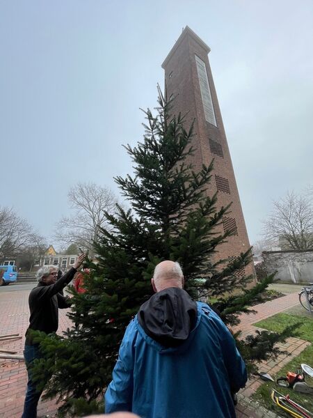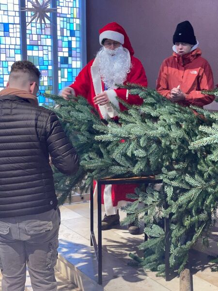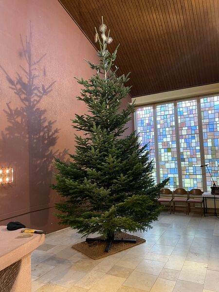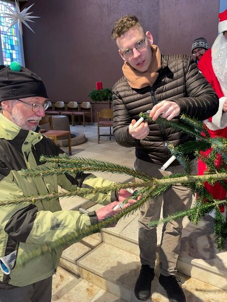 Pastorin Glaubitz freute sich, dass der Baum da ist und von unserem Küster Kai Mehrländer geschmückt werden kann.