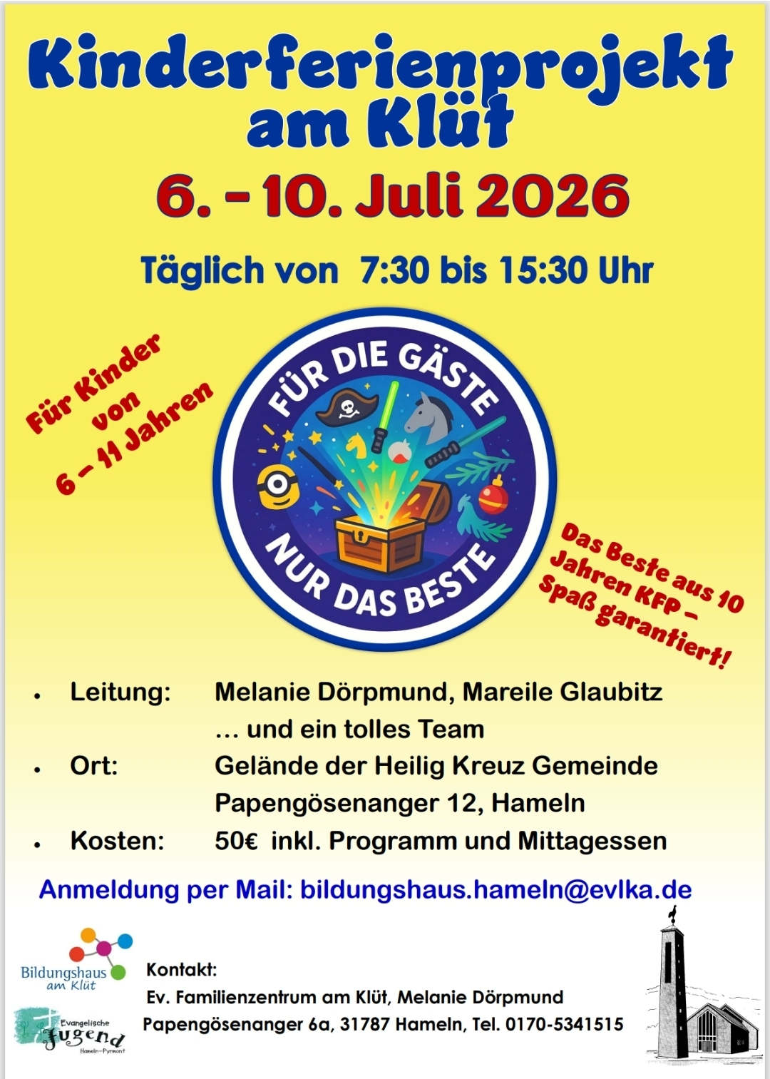 Unterstützt durch viele engagierte und kreative Teamer:innenaus den Kirchengemeinden Afferde und Heilig-Kreuz haben Melanie Dörpmund und ihre Kollegin Christin Menking für Kinder im Grundschulalter eine spannende Ferienwoche gestaltet. Manchmal bei uns im Gemeindehaus, manchmal mit Übernachtung auf der Riepenburg, zu Coronazeiten in Kleingruppen, immer war es bunt und abenteuerlich mit viel Musik und einem Motto und erkennbar am großen Zirkuszelt.